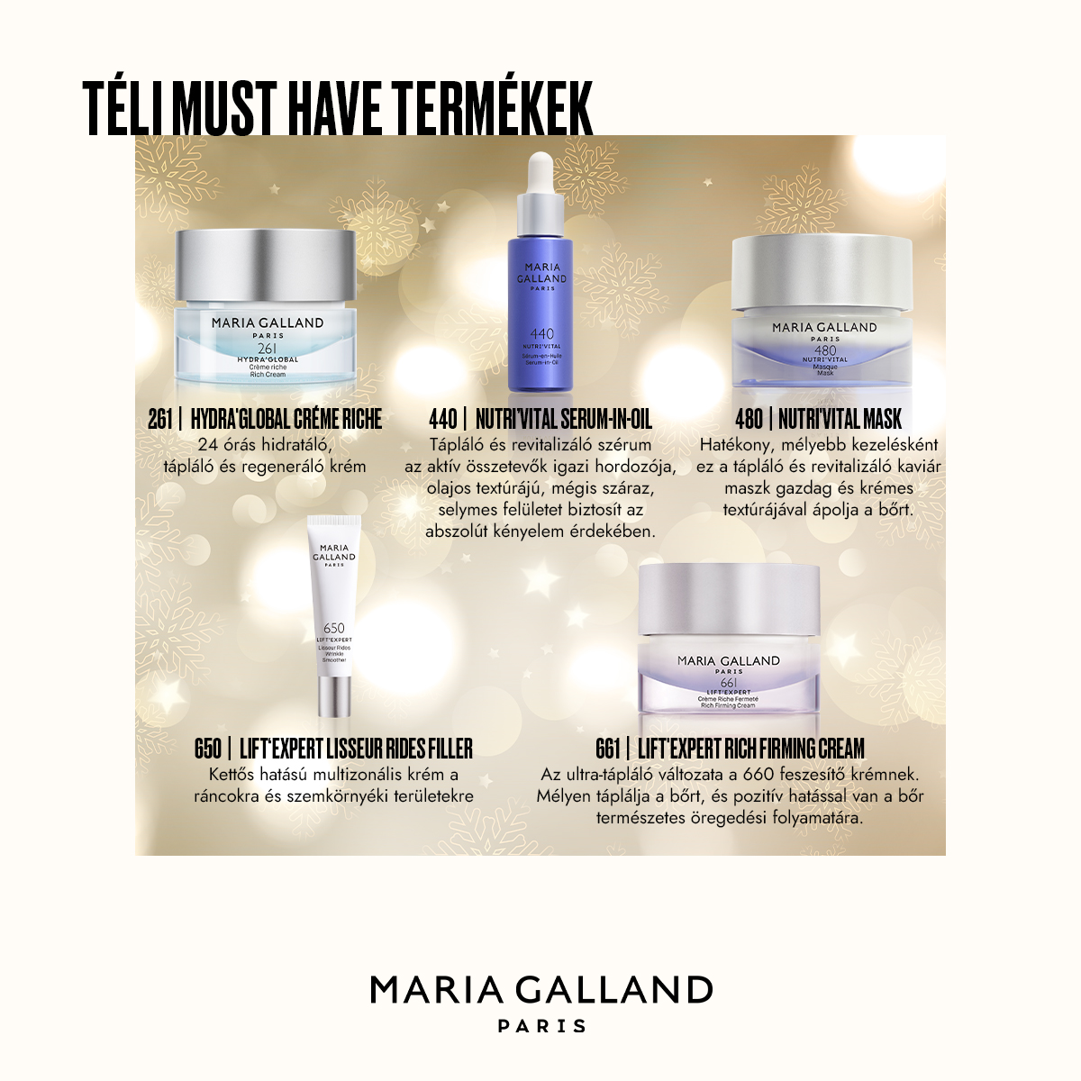 Fedezd fel a Maria Galland téli must have termékeit, amelyek segítenek megőrizni a bőröd ragyogását és hidratáltságát a hideg időjárás ellenére is! Élvezd a luxus kozmetikumok kényeztető élményét és próbáld ki a téli szépség titkait a Maria Gallanddal.